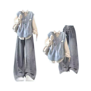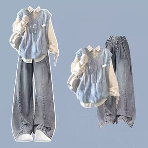 2025早秋新款小个子学院风穿搭针织马甲女+抽绳衬衫件套