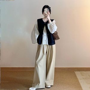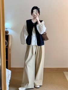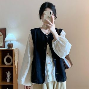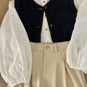 韩系时尚气质休闲牛仔背心马甲开衫+刺绣衬衫+宽松阔腿裤三件套装