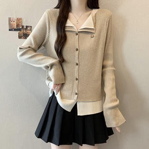 大码法式假两件燕麦色针织衫女秋新款胖mm显瘦遮肉单排扣开衫上衣