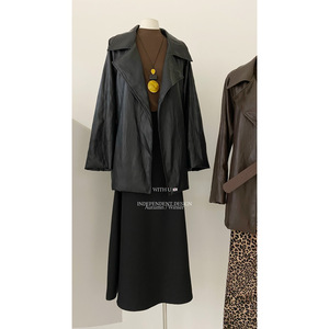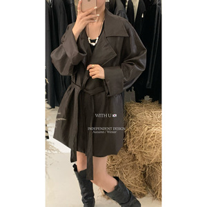 With U-秋上新高级感大翻领蛋白皮衣外套女系带皮衣(配腰绳)1066