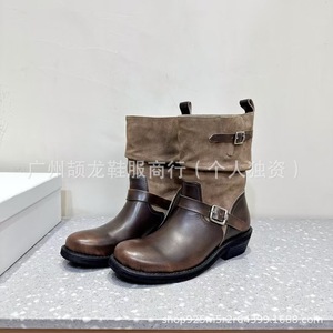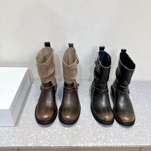 高端小众2025秋冬真皮圆头擦色复古皮带扣粗跟骑士靴中筒堆堆靴女