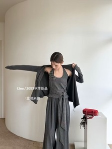 新款辣妹条纹挂脖修身系带背心+开衫+松紧紧休闲裤三件套