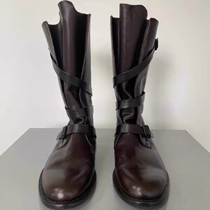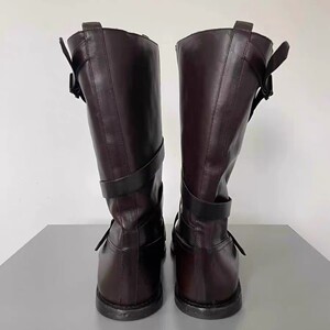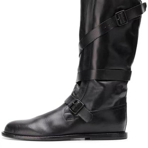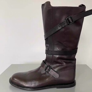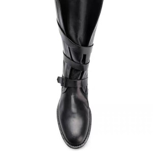 牛皮版~韩版小众中筒机车马丁靴女平底皮带扣圆头骑士靴子西部靴