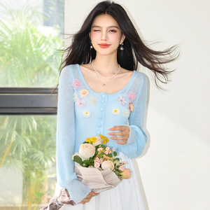 慵懒风立体花朵蓝色针织开衫女2025秋季新款宽松洋气镂空毛衣外套