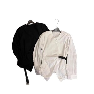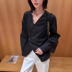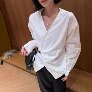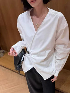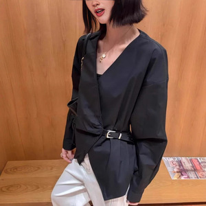 南油2025秋款纯棉名媛风V领侧腰带拼接背后下脚收腰显瘦长袖衬衫