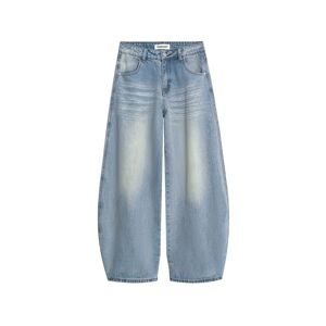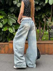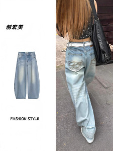 大码复古美式水洗做旧牛仔裤女秋季胖mm宽松高腰显瘦直筒阔腿裤子