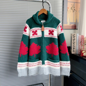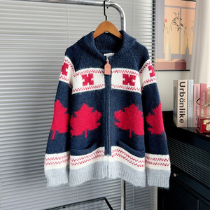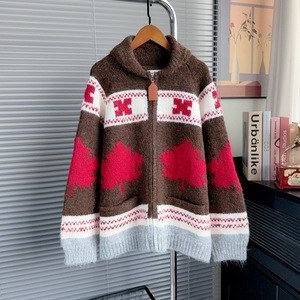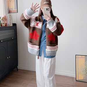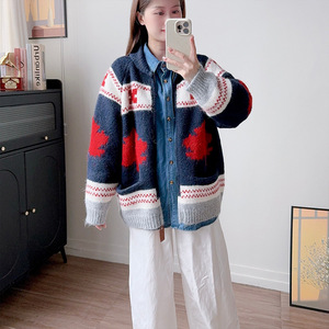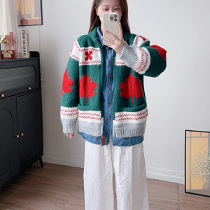 韩国复古翻领新款设计感费尔岛拉链毛衣外套女秋冬季宽松针织开衫