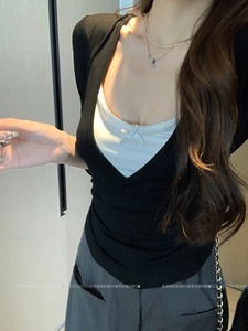 设计感别致假两件撞色长袖T恤女装秋季韩系别致减龄修身显瘦上衣