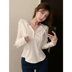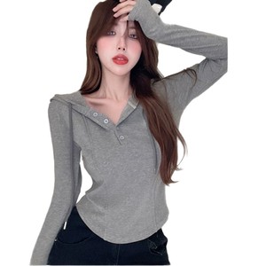 辣妹别致灰色连帽修身秋冬款打底衫女内搭设计感小众长袖T恤秋季