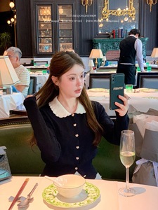 杨小卷 miu系千金穿搭 撞色减龄娃娃领针织开衫女短款上衣 1OO棉
