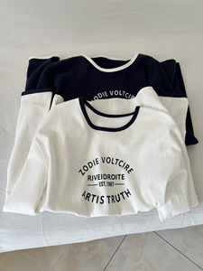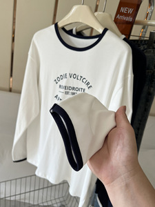 复古撞色圆领休闲减龄字母宽松长袖白色t恤女外穿内搭打底衫上衣