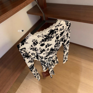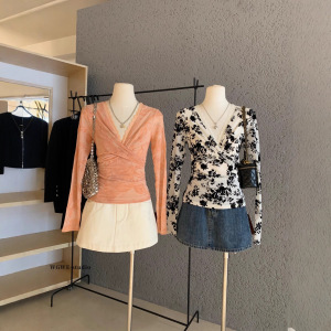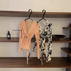 WGWE7214蕾丝花边印花v领长袖T恤设计感绑带收腰纯欲风修身小衫