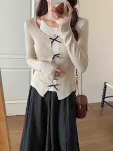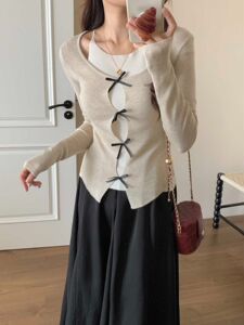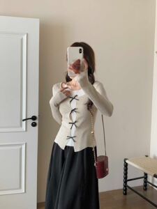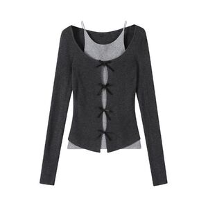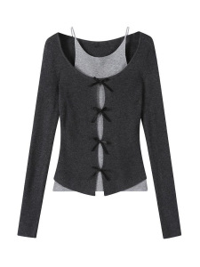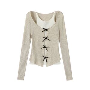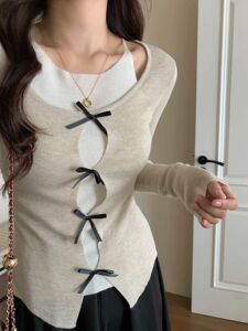 美式纯欲辣妹撞色蝴蝶结针织衫女早秋季假两件修身内搭打底衫上衣