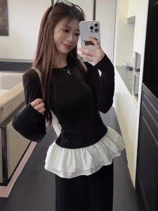秋季新款纯欲风辣妹棉长袖正肩t恤女修身显瘦百搭设计感女打底衫