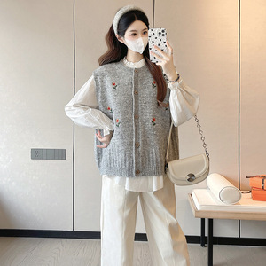 孕妇秋季新款甜美花边领衬衣+刺绣提花马甲+休闲托腹裤潮妈三件套