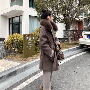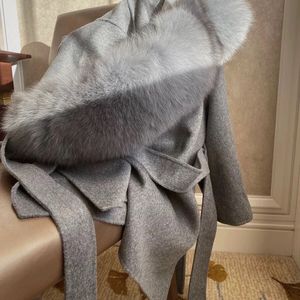 新款超大狐狸毛领连帽双面羊绒大衣女中长款100纯羊毛羊驼绒外套