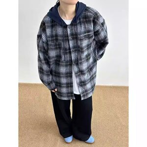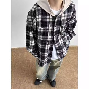 美式假两件格子连帽衬衫男女秋季宽松休闲衬衣外套慵懒风情侣夹克