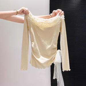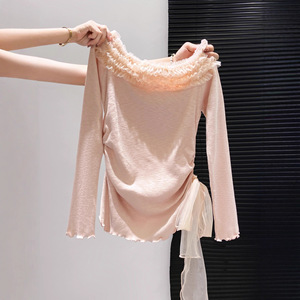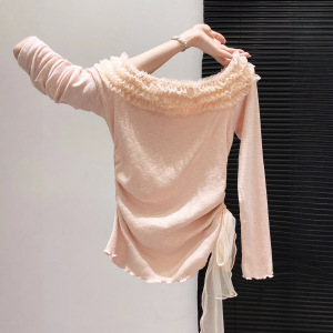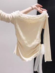 纯欲风蕾丝拼接木耳边一字领长袖t恤女秋季褶皱收腰显瘦露肩上衣