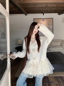 法式网纱拼接长袖毛衣2025秋季新款中长款立体花朵设计感外套女潮