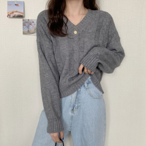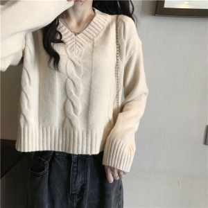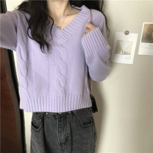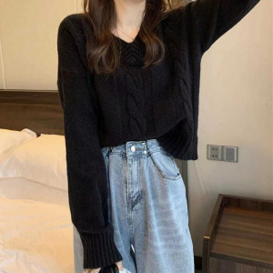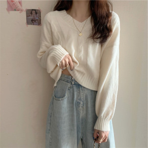 秋季气质设计感小众慵懒风v领长袖打底针织衫上衣小个子短款毛衣