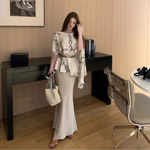 RHGD实拍气质吊带连衣裙+小众设计印花双面缎斗篷套装