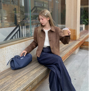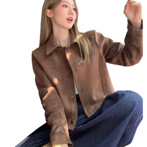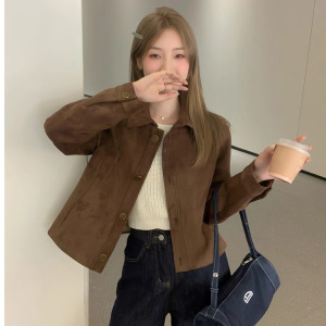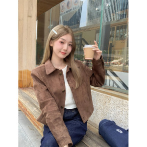 复古咖色翻领麂皮绒短外套女秋季感机车风气质超好看夹克短外套