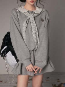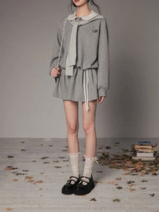 原创秋季灰色假两件长袖卫衣连衣裙韩系气质短裙