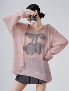 粉色樱桃提花连帽套头毛衫女新款韩版宽松慵懒风针织毛衣