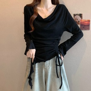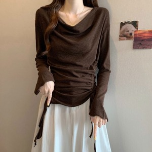 美拉德时尚咖色荡领长袖t恤女秋季大码胖mm收腰不规则打底衫上衣
