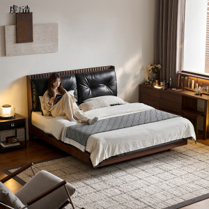 黑胡桃木实木床真皮全青皮法式复古中古风主卧软包2025新款大床