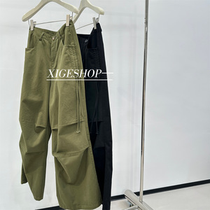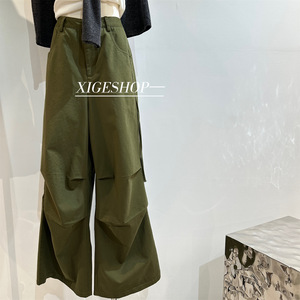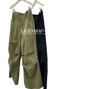 抽褶军绿色工装裤女设计感中低腰棉质美式休闲直筒阔腿裤长裤子秋