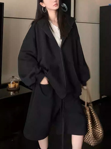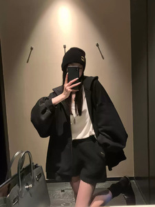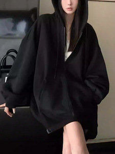 欧欧欧阳黑色连帽拉链卫衣外套女冬季加绒加厚慵懒风休闲宽松上衣