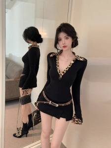 美式时尚设计感豹纹拼接polo领深V早秋T恤修身收腰显瘦百搭上衣潮