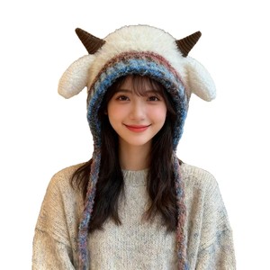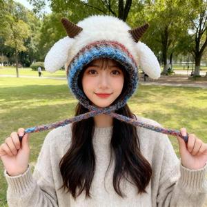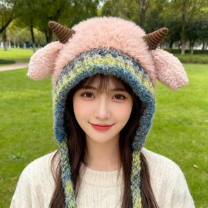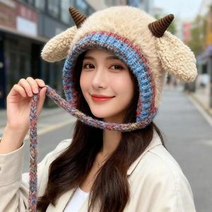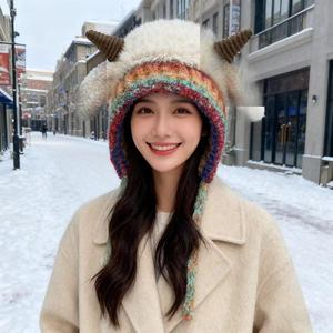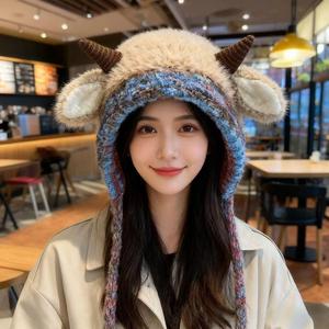2025新款民族风羊角毛绒毛线帽子女秋冬保暖百搭护耳针织帽显脸小