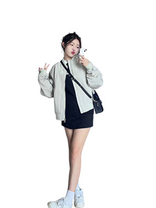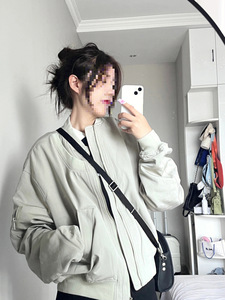 复古灰白色美式棒球服外套女秋冬季大码胖宽松显瘦工装夹克上衣