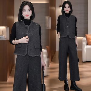 小香风时尚套装女秋装新款好看无袖马甲半高领打底衫阔腿裤三件套
