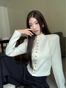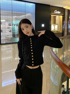 黑色金属扣廓形针织开衫女秋季高级感修身气质短款内搭打底衫上衣