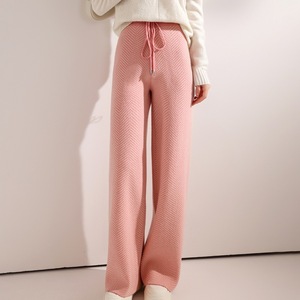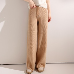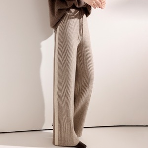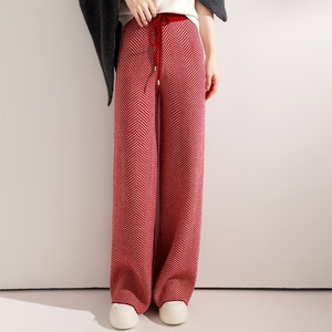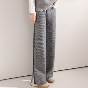 新款条纹100羊毛阔腿裤女秋冬复古长裤慵懒垂感针织人字纹休闲裤