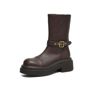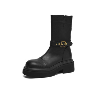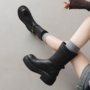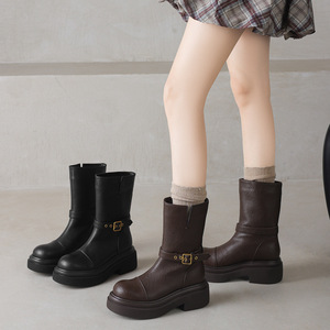 小个子舒适增高厚底牛皮烟筒靴2025粗高跟皮带扣圆头真皮中筒靴子