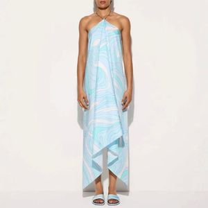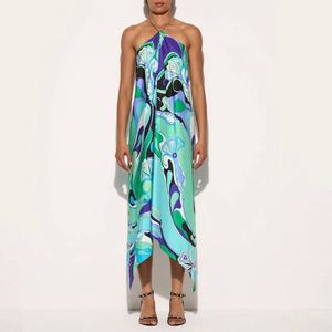 女士时尚跨境欧美新款印花简约风印花挂脖无袖长裙不规则连衣裙