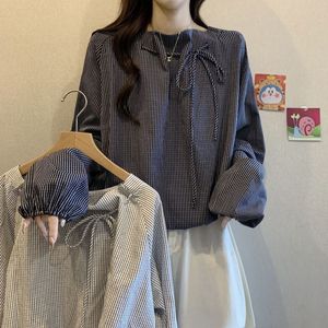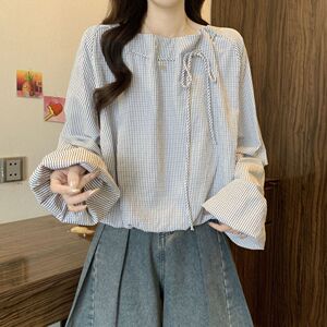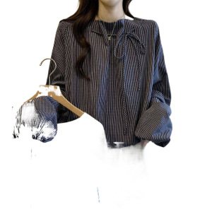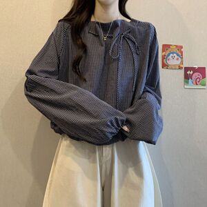 新款条纹长袖衬衫大码胖秋季巨好看小衫别致遮肚上衣女