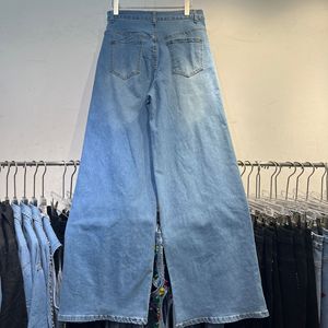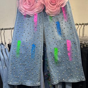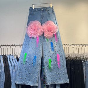 2025秋季新款牛仔阔腿裤女时尚立体网纱粉玫瑰重工钉钻显瘦长裤