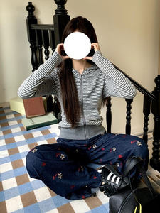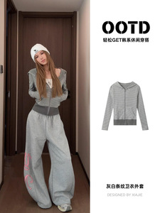 灰白条纹修身卫衣外套女秋薄款修身连帽运动开衫韩系简约慵懒穿搭