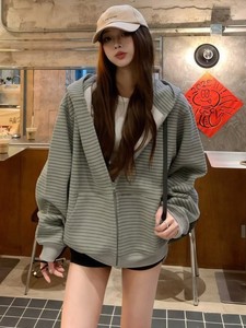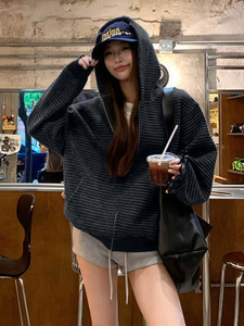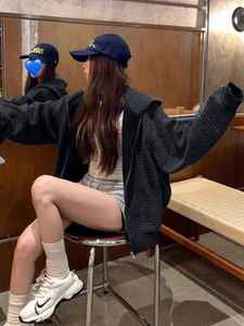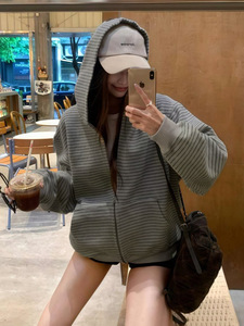 美式复古韩系连帽卫衣外套女秋季慵懒风宽松条纹撞色开衫百搭上衣