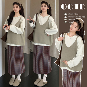 孕妇Z装秋冬套装慵懒宽松长袖T恤针织马甲条纹半身裙三件套