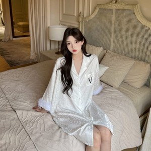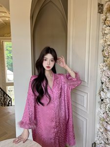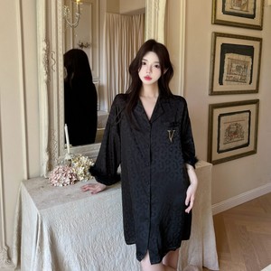 春夏新款豹纹衬衫裙冰丝睡衣高级感羽毛薄款冰雪丝开衫家居服