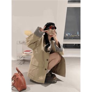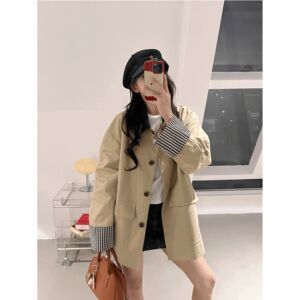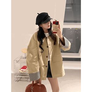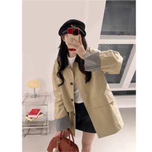 韩系新款高智巴恩风卡其色风衣撞色格纹拼接短款宽松外套女春秋季