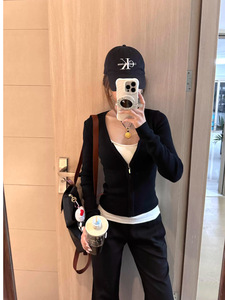 韩系黑色开衫假两件长袖T恤女早秋穿搭修身拉链显瘦纯欲薄款上衣
