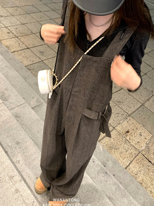 WANANTONG 小众私服UMA 自带时髦感仿羊毛人字纹背带裤休闲裤女秋