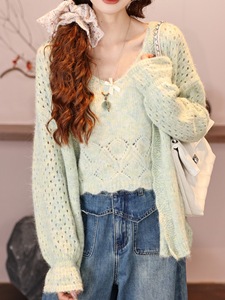 绿色清新针织开衫女秋季新款宽松镂空波浪通勤显瘦外搭纯色两件套